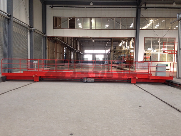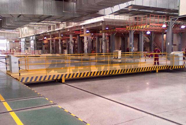 KPG滑觸線電動平移換軌車供電方式是:在軌道側(cè)面開設地溝,地溝內(nèi)安裝安全滑觸線,地溝上鋪有單面用鉸鏈固定于地上的蓋板或安裝于地溝的側(cè)面。電動平車運行時通過安裝在地溝翻板裝置,將蓋板掀起,翻板裝置內(nèi)有同安全滑觸線集電器聯(lián)接的電纜。電動平車通過后蓋板自動放回地面,能保證無軌車輛順利通過。KPG側(cè)滑觸線電動平車不受運行距離的限制。將交流380V的安全滑觸線直接引入平車交流控制系統(tǒng),來控制平車的啟動、停止、前進、后退等。通過平車的移動帶動安全滑觸線的滑塊來實現(xiàn)給平車供電,安全滑觸線受安裝未知的限制,可以安裝在地溝內(nèi)側(cè)墻體上,來實現(xiàn)地溝內(nèi)的電源引入軌道平車上,操作系統(tǒng)為低壓AC36V電源控制。是車間流水生產(chǎn)線的 ;該平車適用于運行距離不長(≤200m)、使用頻率極高、整車高度較低、流水線作業(yè)等場合。