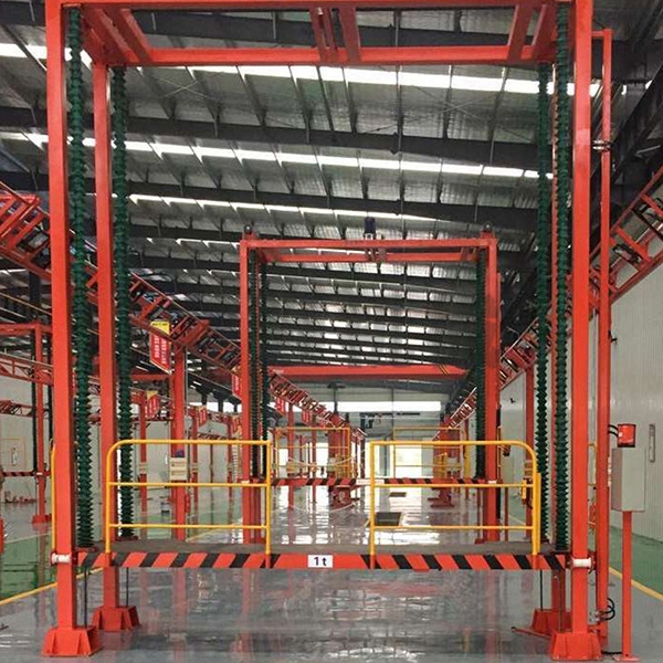 本設備系采用制動電機連接減速機減速后,通過主軸及鏈輪、鏈條的機械傳動方式改變運動方式,以導向柱導向輪等組成的導向機構(gòu),操作平臺升降過程的相對穩(wěn)定和整機剛性,在邊立柱的鏈條一端加配重錘,以減少電機工作負荷,減少振動幅度,以達到平臺升降平穩(wěn)的目的,并采用鋼絲繩保險裝置,鋼絲繩兩端分別與平臺及配重錘連接。當鏈條發(fā)生斷裂時,因鋼絲繩與平臺配重錘連接不至于平臺突然下墜,以是的操作人員能及時調(diào)整平臺,從而使得操作人員的人身保障。
