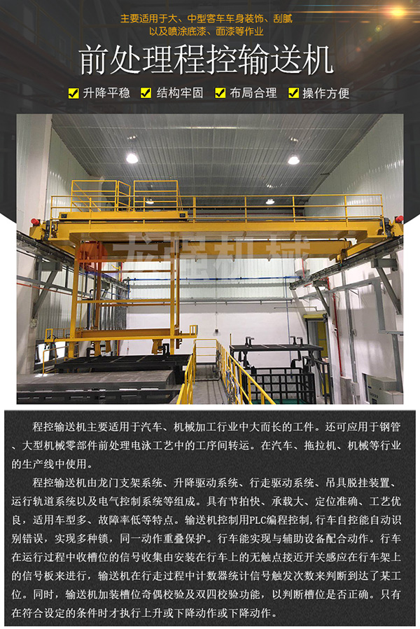 • 程控輸送機(jī)主要適用于汽車、機(jī)械加工行業(yè)中大而長的工件。還可應(yīng)用于鋼管、大型機(jī)械零部件前處理電泳工藝中的工序間轉(zhuǎn)運。在汽車、拖拉機(jī)、機(jī)械等行業(yè)的生產(chǎn)線中廣泛使用。